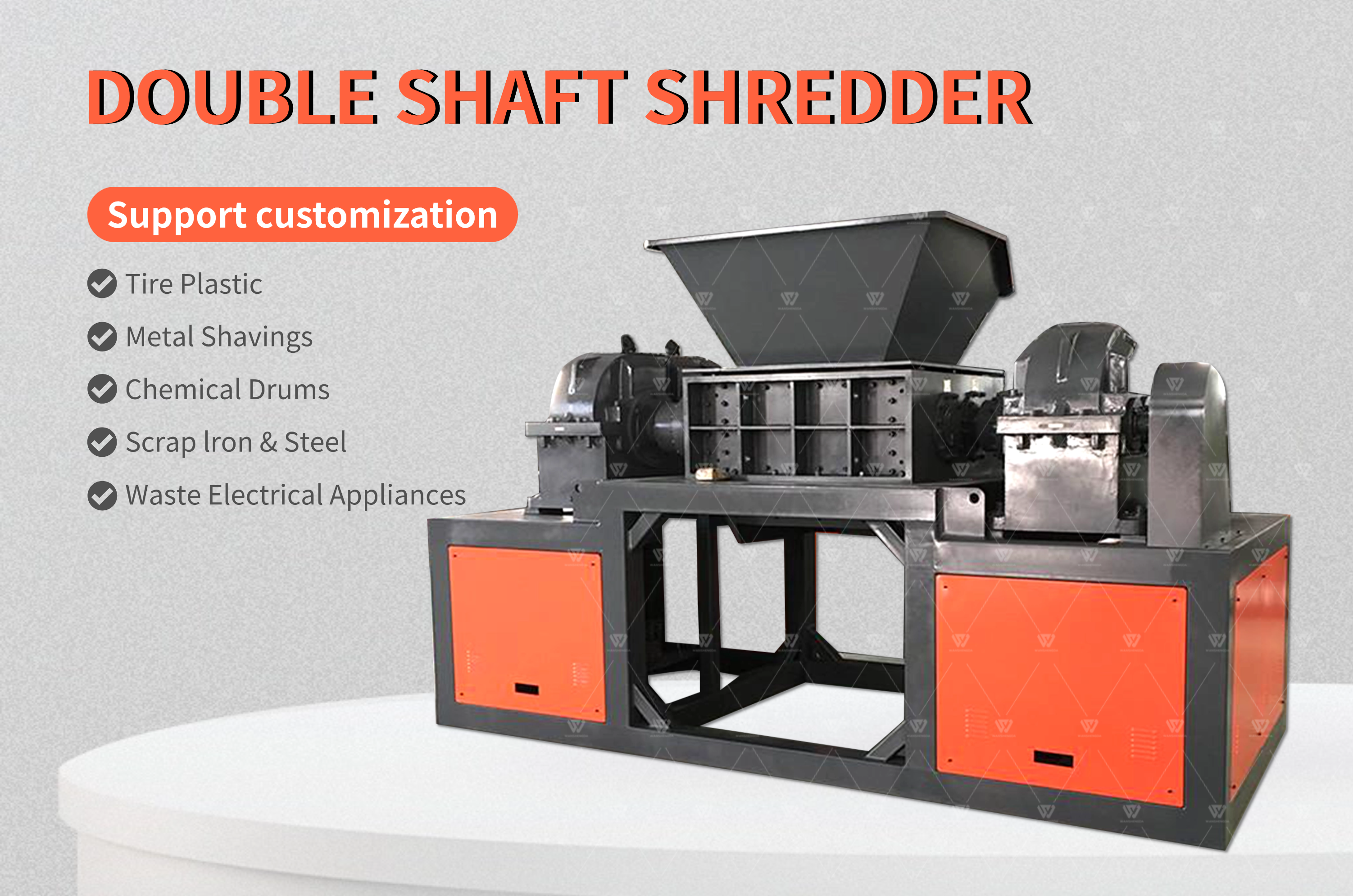 1 、本品对于一轴粉碎机难粉的大块料、筐料 、管材、板材、木材、轮胎、废旧金属桶、大卷薄膜都可破碎;