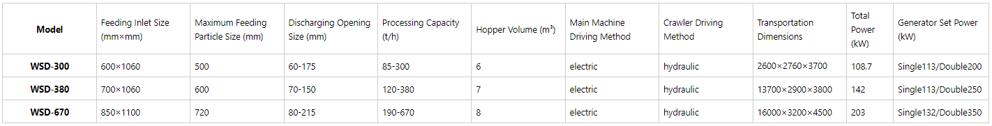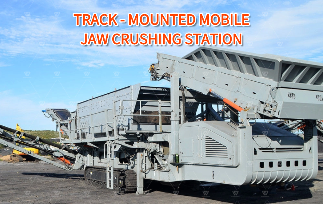 履带式颚式破碎站的所有部件都在船上,包括:坚固的机架、颚式破碎机、给料机、输送机、电机、控制箱等。物料由给料器大致分拣。直径小于筛棒间隙的由侧输送机卸料,直径大于筛棒间隙的由颚式破碎机破碎后由主输送机卸料。移动式颚式破碎机可直接对物料进行初步破碎,与其他破碎设备配合使用时操作方便灵活。